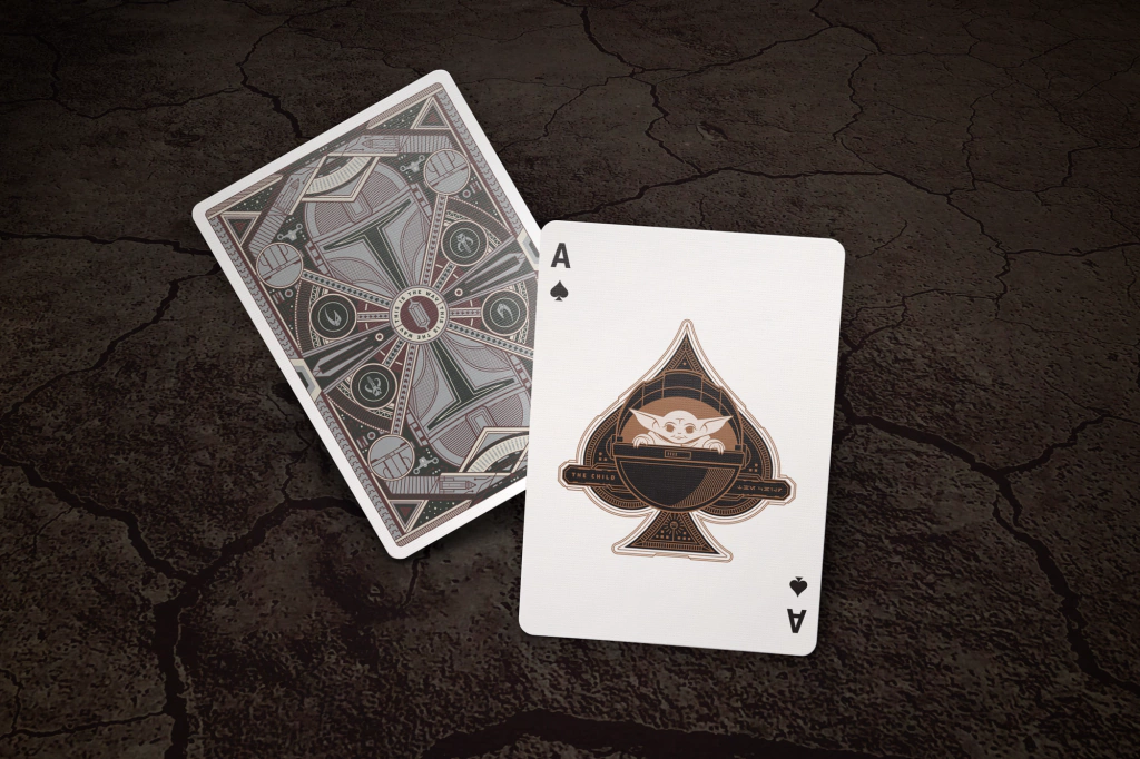 O deck é simplesmente de tirar o fôlego. Prata Beskar, preto espacial e folhas vermelhas impressionantes envolvem as cartas, com relevo 3D esculpido do capacete de Mandalorian.