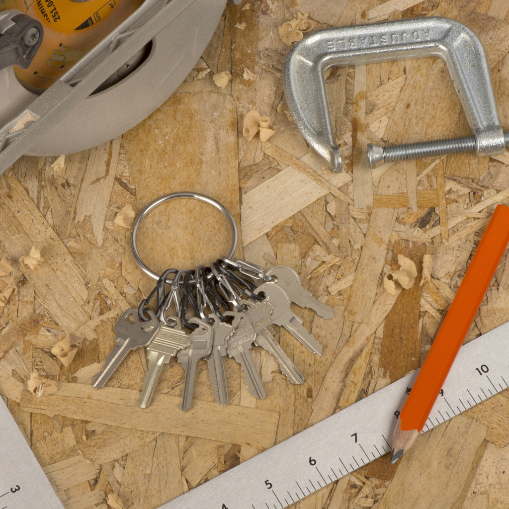 Organizador composto por argola de aço inox de 2" (50,8 mm) e 8 conectores S-Biner (moquestão de dupla conexão) em aço inox, sendo 4 escovados e 4 pretos.