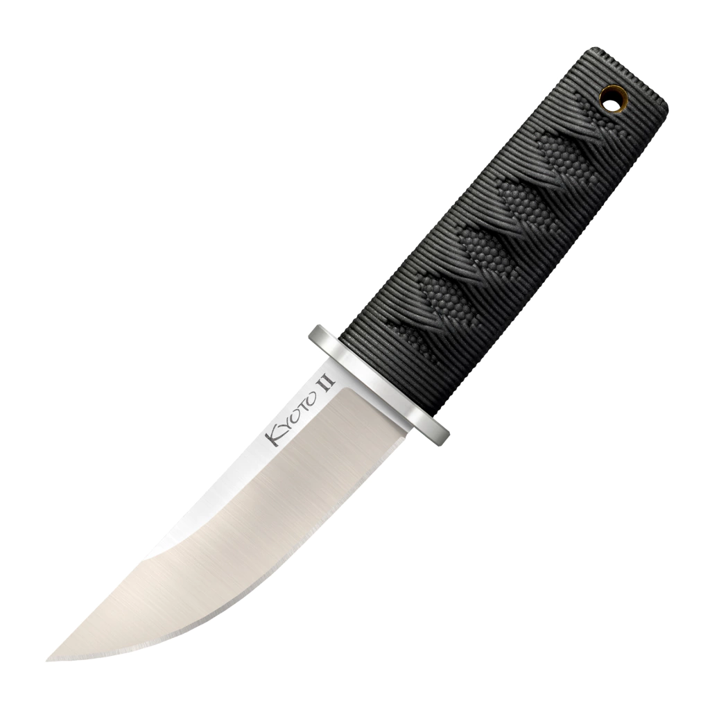 A robusta lâmina tem espiga full tang, que percorrem todo o comprimento do cabo. Pareado a guarda de aço inoxidável o cabo em Kray-Ex® é estilizado afim de imitar a aparência dos cabos das espadas japonesas tradicionais, enroladas em cordão. A bainha fina e confortável é versátil e aceita um cordão de corrente de bolinhas ou um C-Clip da Cold Steel, para que a Kyoto possa ser transportada de várias maneiras.