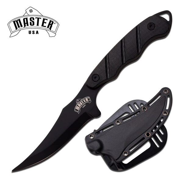 Faca lâmina lisa preta com bainha em nylon rigido. Tamanho total: 22,9 cm. Tamanho da lâmina: 11,4 cm. Material da lâmina: Aço inox.