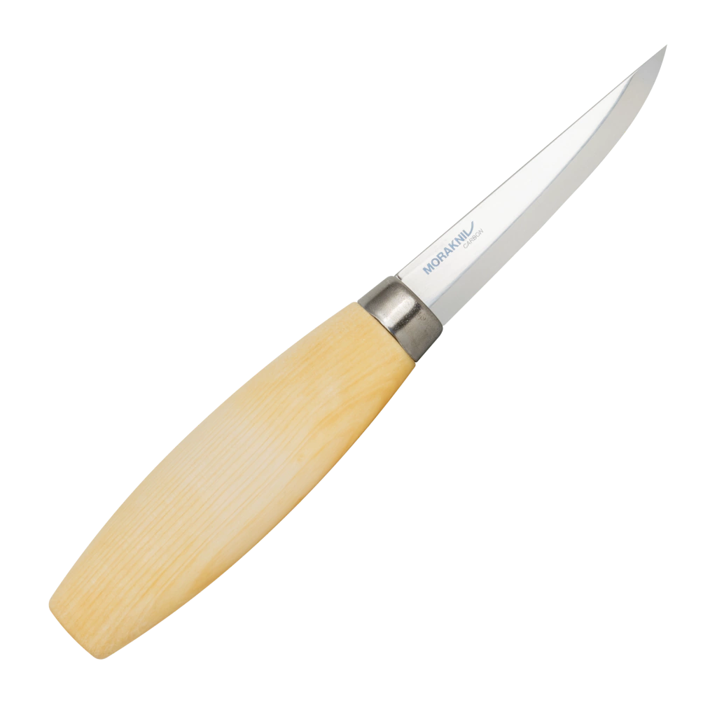 A faca de entalhar madeira Morakniv Woodcarving 106 (C) possui uma lâmina fina e pontuda de aço carbono laminado.