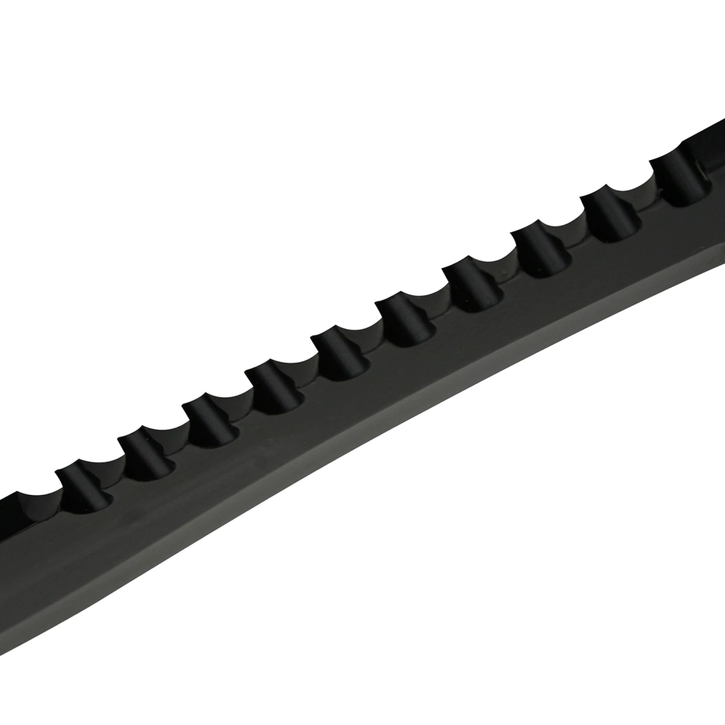Faca Survivor estilo militar, lâmina com revestimento preto e serra no dorso, cabo emborrachado e bainha de plático rígida.