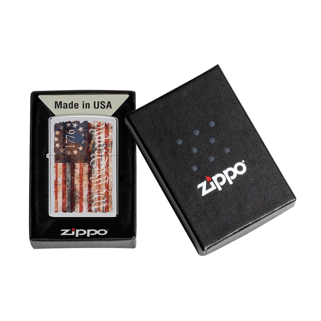 Usando o comprovado processo de imagem colorida Zippo, este isqueiro cromado de alto polimento traz uma bandeira americana inspirada em Betsy Ross com 1776 e as palavras "We the People" servindo como um lembrete das liberdades do povo americano. Vem embalado em uma caixa de presente. Para um desempenho ideal, abasteça com combustível de isqueiro Zippo.